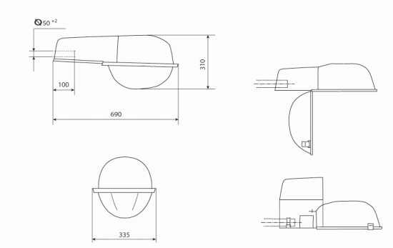 - Светильник рекомендуется устанавливать на Г-образных кронштейнах опор под углом 15 - 20° к горизонту. Диаметр трубы оголовника кронштейна 48 мм. Высота установки светильников 6 - 12 м