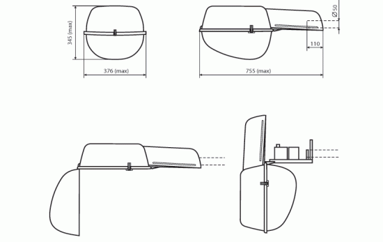 - Светильник рекомендуется устанавливать на Г-образных кронштейнах опор диаметром трубы оголовника кронштейна 48 мм под углом 0 - 20° к горизонту. Высота установки светильников 8 - 12 м