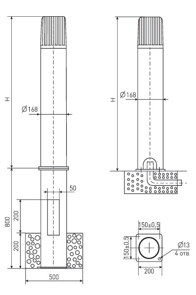 - Светильник рекомендуется устанавливать одним из способов: 1) фланцевое крепление к горизонтальной бетонной площадке с использованием четырех залитых в бетон шпилек 2) фланцевое крепление болтами и гайками М12 к пластине подземной части светильника